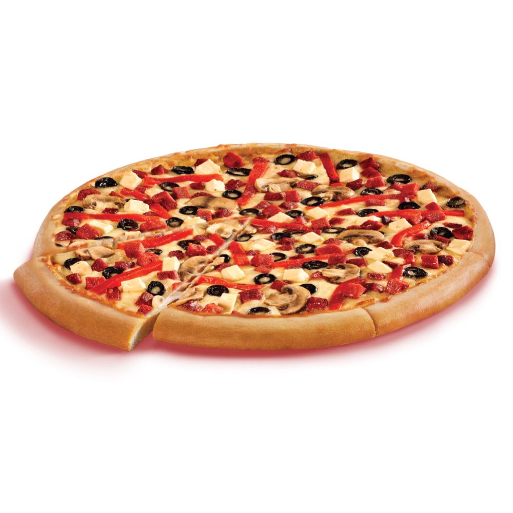 Özel pizza sos, mozzarella peyniri, siyah zeytin, beyaz peynir, mantar, yeşil biber, domates