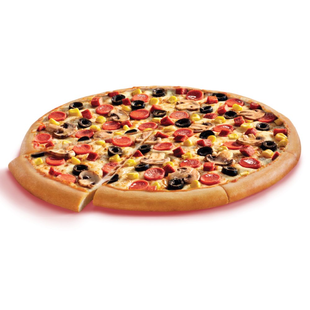 Özel pizza sos, mozzarella peyniri, siyahzeytin, mantar, mısır, yeşilbiber, domates