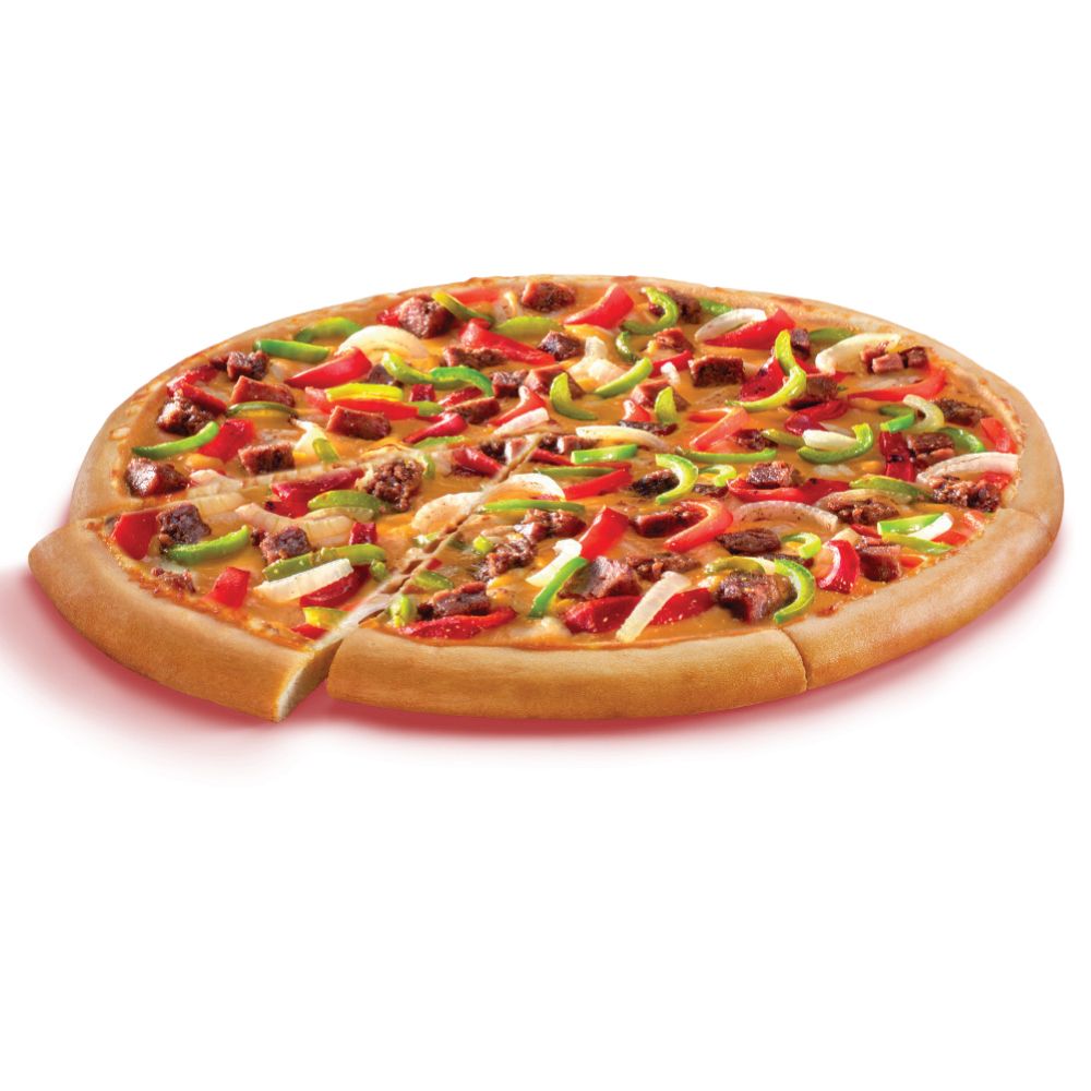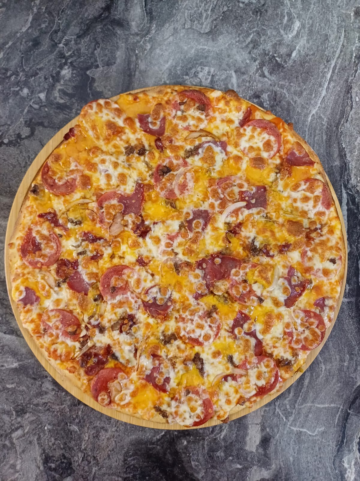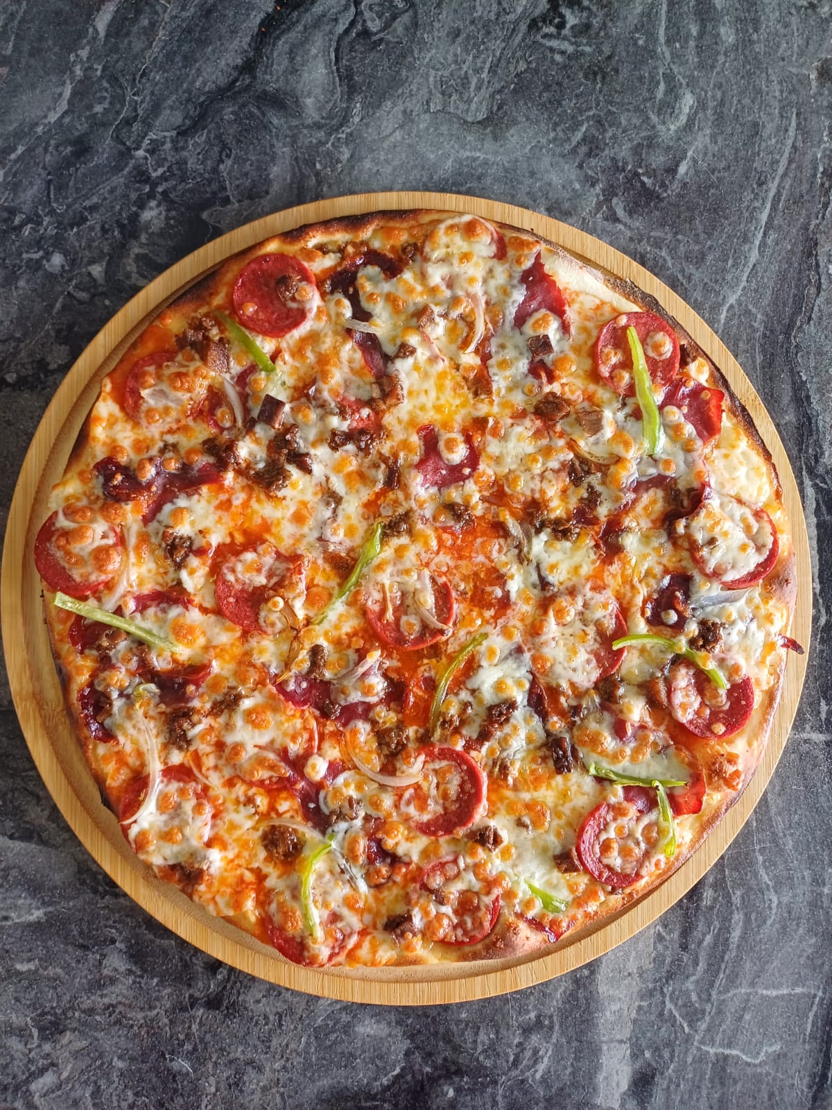 Özel pizza sos, mozzarella peyniri, dana kavurma, soğan, yeşilbiber